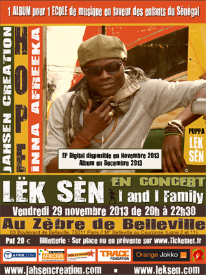 Puppa LËK SÈN présente son nouvel album « Hope Inna Afreeka » : 1 ALBUM + 1 CONCERT pour 1 ECOLE de MUSIQUE en faveur des enfants de son village natal, Ngor au Sénégal. Quelques mois après la sortie de son 2ème album « Tomorrow », salué par l’ensemble des critiques de Musique du Monde, LËK SÈN, ce jeune chanteur Sénégalais à la voix éraillée, et son groupe « I and I Family » présentent « Hope Inna Afreeeka », un album « Urban Blues » à découvrir aussi en Live !