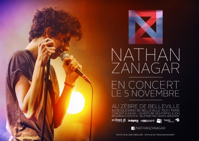 Nathan Zanagar sera sur scène au Zèbre de Belleville à Paris pour une soirée unique le 5 novembre 2013. De nouveaux titres originaux y seront dévoilés pour la première fois ! À l’image des précédents concerts, ce sera comme une grande fête mais cette fois ci dans un cabaret. Alors sortez le style, on vous attend sous toutes vos facettes, que vous soyez un N chaviré ou un Z renversé…